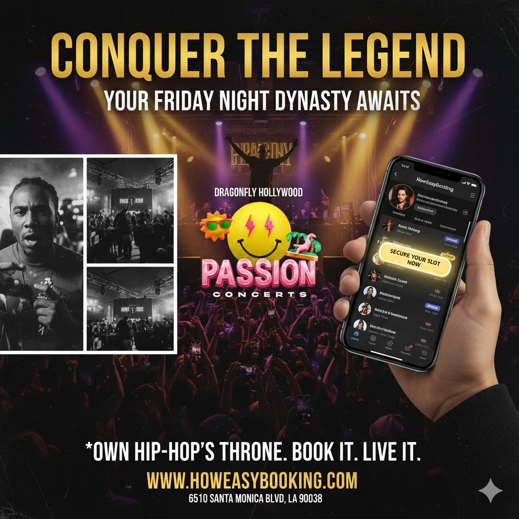 How Easy Booking proudly presents your exclusive opportunity to perform at Dragonfly Hollywood's "Passion Fridays" – the epicenter of Hip-Hop culture and nightlife in Los Angeles. This is where legends are forged, where the beat pulses with the heart of black culture, and where your unique artistry finds its ultimate spotlight.